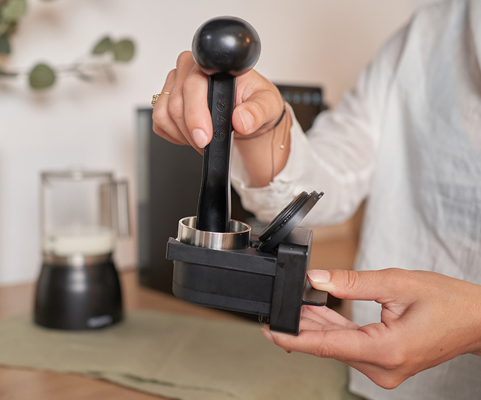 Afegeix l’adaptador a la sortida de cafè molt i dona-li al botó dels grans; després, premsa el cafè molt amb l’accessori de tamping i, finalment, introdueix l’adaptador en la sortida de la beguda per a preparar la teva recepta. Així de fàcil!