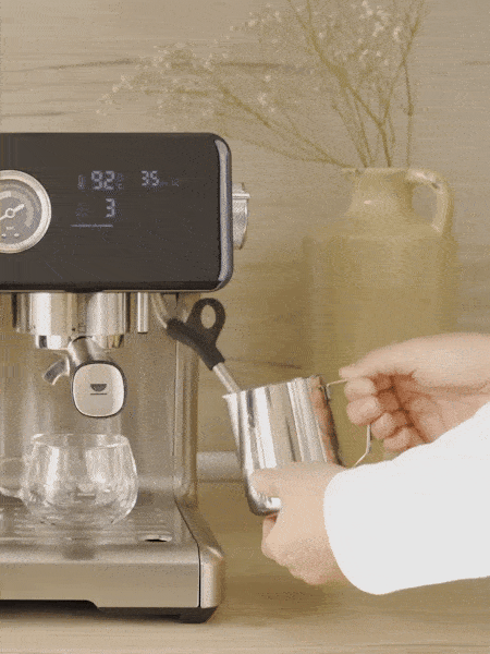 Además, su lanza de vapor con sensor de temperatura integrado controla el proceso y se detiene automáticamente cuando la leche alcanza la temperatura seleccionada. ¿El resultado? Una textura perfecta y espuma de barista, sin ninguna complicación.